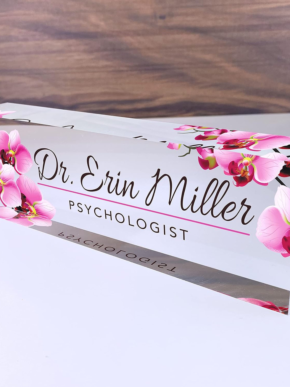 Artblox Custom Desk Name Plate - Orchids Design on Clear Acrylic Glass - Person