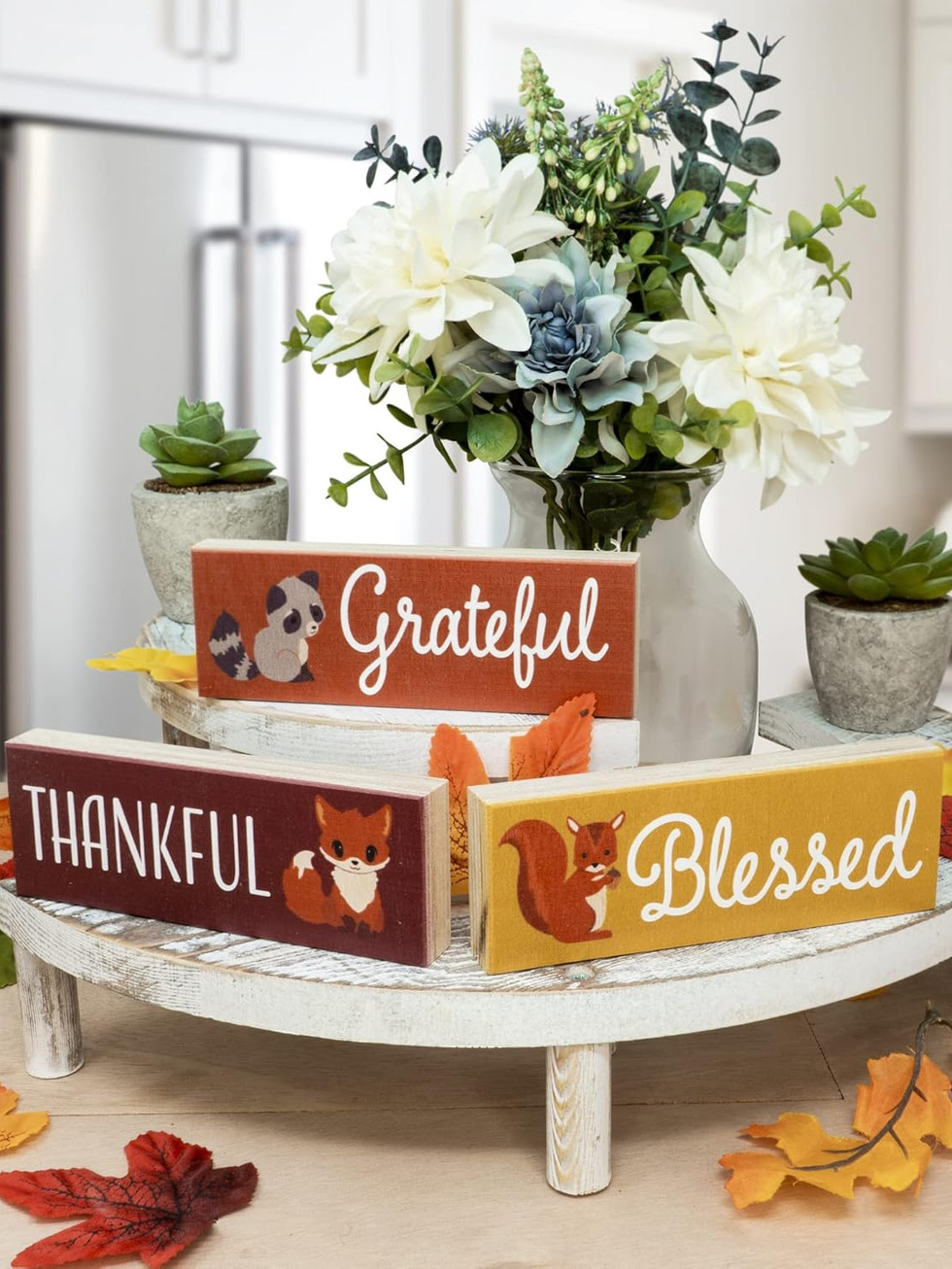 - This is a set of 3 wooden blocks that reads Grateful Thankful Blessed. Each block measures 5.5 x 2 x .75 inches. Display on a flat surface, such as a shelf, desk, or counter. Set features autumn colors and cute woodland animals for fall decorations.