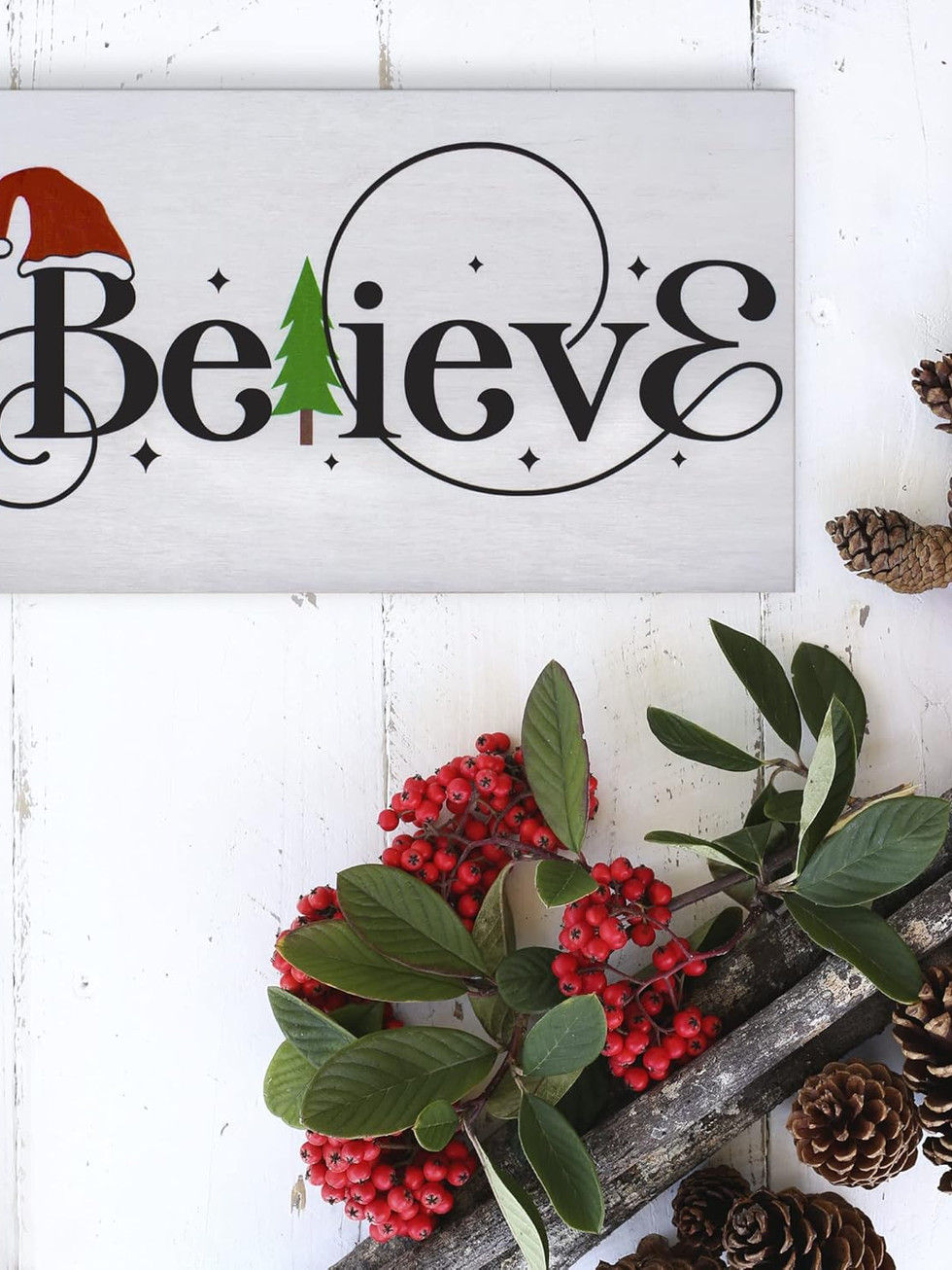 - Christmas Decorations Indoor | Farmhouse Christmas Decorations: This cute & fun holiday decorative sign can be displayed in many ways! If you are enhancing your mantel, add this to your fireplace decor. Decorating a Christmas tablescape? Add this believe accent to your Christmas table runner. This festive sign will add holiday flair to your farmhouse decor, shelf decor, living room decor, desk decor, kitchen decor, and farmhouse wall decor.