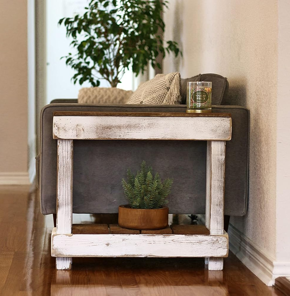 Light is not included. Please read and understand the nature of our reclaimed wood before purchasing this product. Our Luxe Accent Table will make the perfect addition to your home. The table measures 26x8x23H and is made entirely of reclaimed wood. Please note that the wood tops are not sealed or stained and because we use reclaimed wood, the wood tones and grains vary. We receive a different supply every day, and cannot guarantee requested wood tones, unfortunately, because they are different each time. This table makes a great side table for any sofa and will add the right amount of rustic charm to your space.