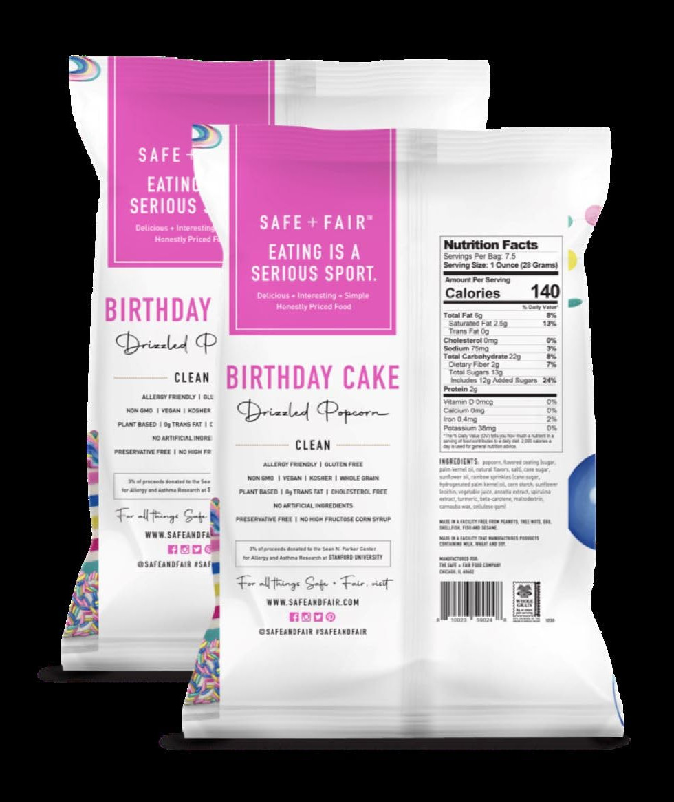 - The Safe & Fair Food Company Drizzled Popcorn, Birthday Cake, Vegan Friendly, Kosher, Gluten Free & Non-GMO, 5.5 Ounce (Pack of 6)