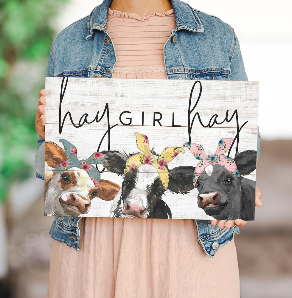CUTE COW DECOR - Wood farmhouse sign reads "Hay girl hay" and features cute cows with bandana bows.