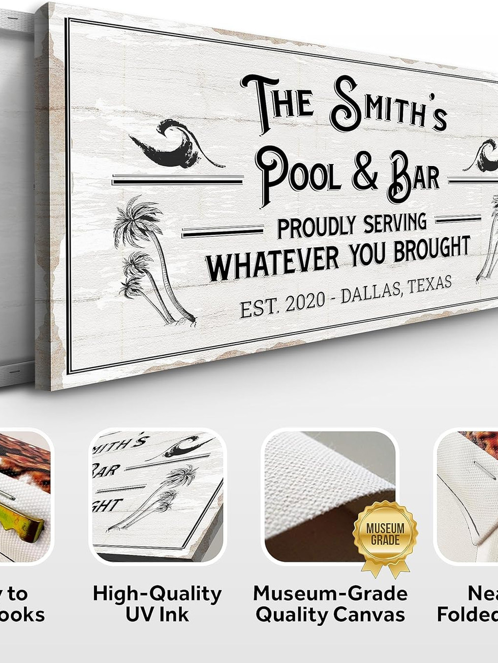 Museum-Grade Quality - This Prime Pool and Bar Sign Gallery-Wrapped Canvas; No sagging, dents, accidental rips; This rustic Pool and Bar Sign wall decor is Printed using UV-Resistant Ink with a neatly folded edge.