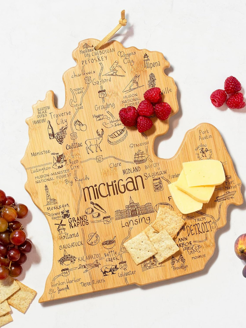 FUN LASER-ENGRAVED ARTWORK: Features engraved artwork highlighting the top towns and attractions in Michigan; board measures 11-3/4" x 13-1/4"x 5/8"
