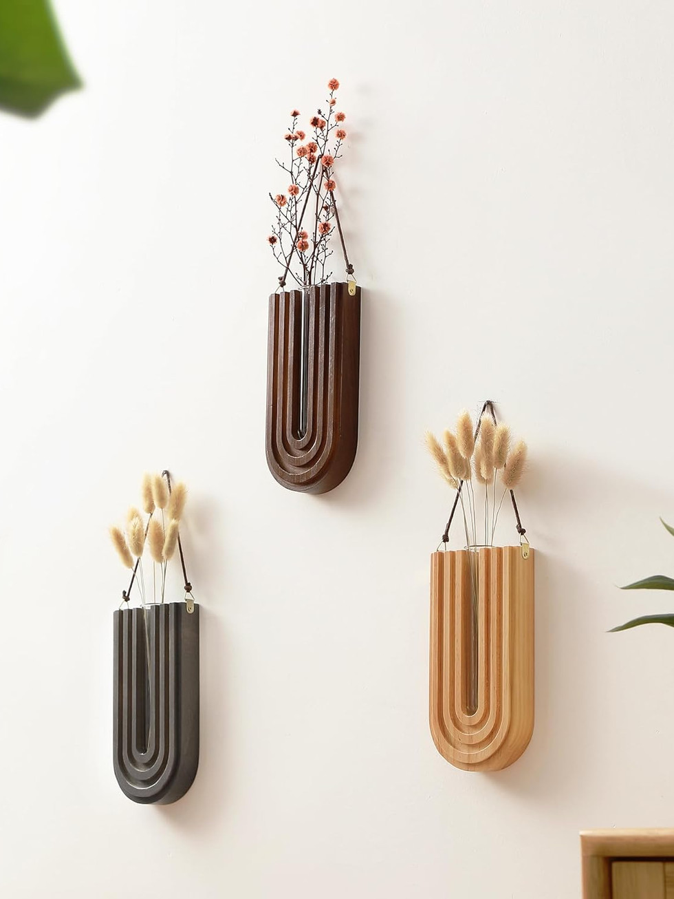 [Easy Installation] – It's handy to hang it on any wall by pushing pins or nails. PACKAGE INCLUDES: 3 Pieces of solid wooden wall vase of 3 colors, 3 sets of anchors and screws (Flowers Not Included)
